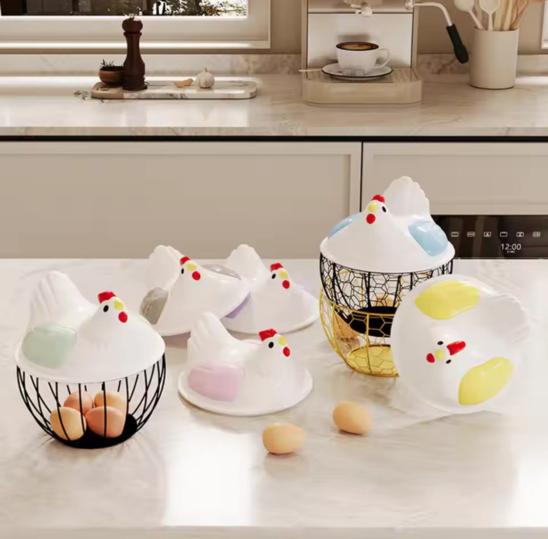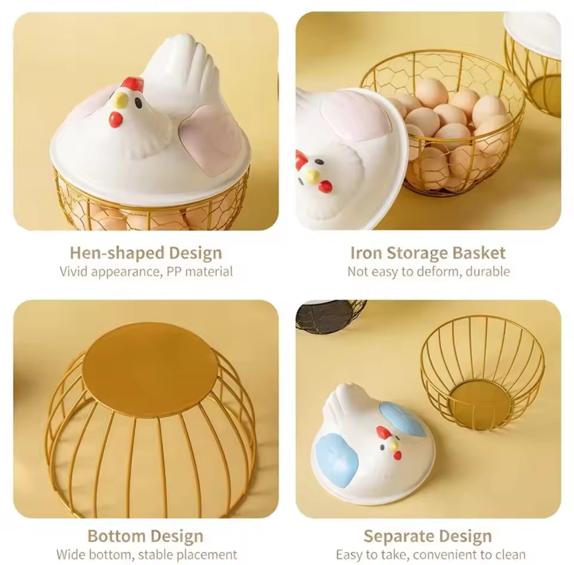 This hen shaped egg basket with lid is a practical and charming storage solution designed to keep eggs safe, organized, and easily accessible in your kitchen. made from durable, food safe material, this multifunctional portable egg storage basket features a secure lid to protect eggs from dust and damage while offering a large capacity to store multiple eggs at once. the cute chicken design adds a decorative farmhouse touch, making it perfect for kitchen counters, refrigerators, or pantry storage. lightweight and easy to carry, this chicken egg basket is ideal for home use, small farms, or grocery trips, combining functionality, convenience, and style in one smart egg holder.