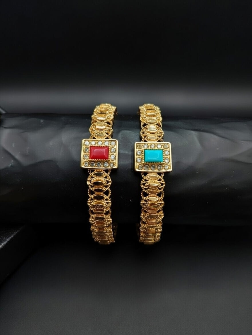Crafted in a rich gold-tone finish, each kara features a square centerpiece adorned with fine stone detailing, adding a touch of sophistication and charm.