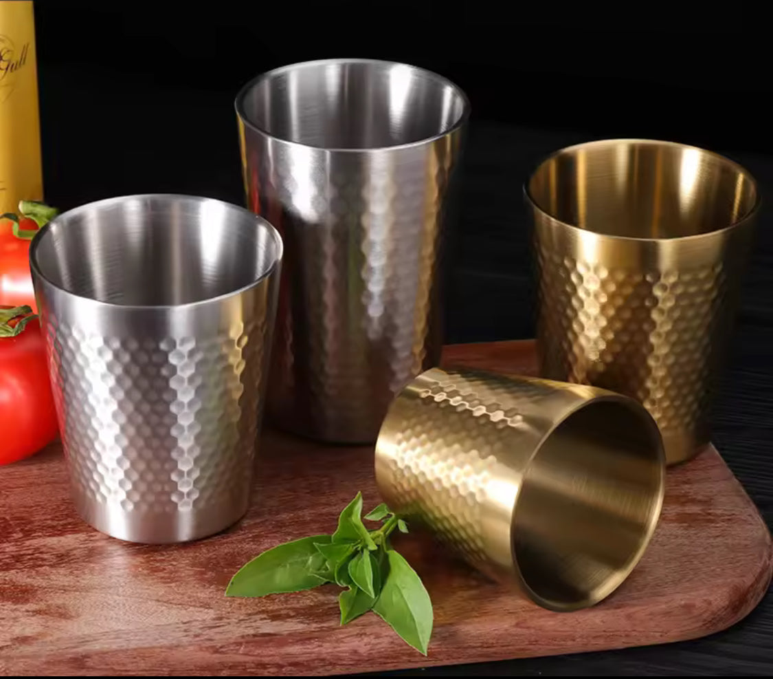 This stainless steel hammered texture cup features a double wall design that helps keep beer, cold water, and other drinks chilled for longer. made from durable stainless steel, it is sturdy, rust resistant, and comfortable to hold with a stylish textured finish. perfect for parties, gatherings, and everyday use, this reusable drinkware cup adds a modern and elegant touch to any occasion.